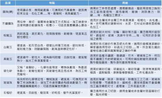 # 噴砂的不同材質特點及用途可參考左圖